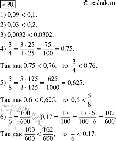 198. Сравнить числа: 1) 0,09 и 0,1; 2) 0,03 и 0,2; 3) 0,0032 и 0,0302; 4) 3/4 и 0,76; 5) 0,6 и 5/8;