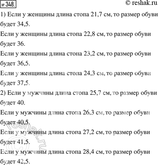348. Рассуждаем. В таблицах приведено соответствие длины стопы и размера обуви для женщин и мужчин: