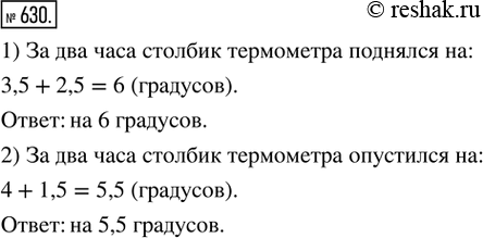 630. (Устно.) 1) Столбик термометра поднялся за первый час на 3,5 градуса, за второй — на 2,5 градуса. На сколько градусов поднялся столбик термометра за эти два часа?