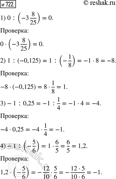 722. Вычислить и сделать проверку умножением: 1) 0 : (-3 8/25); 2) 1 : (-0,125); 3) -1 : 0,25; 4) -1 :