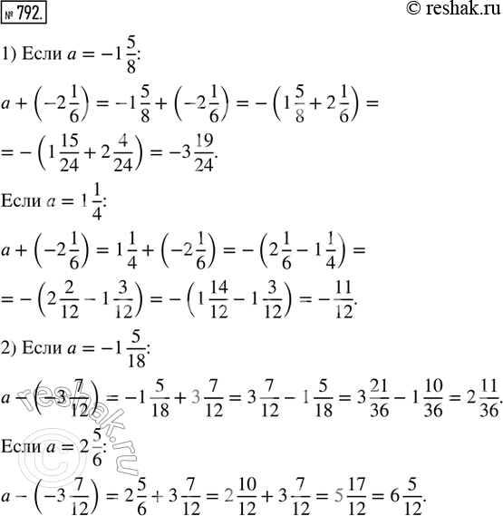 792. Найти значение выражения: 1) а + (-2 1/6), если а = -1 5/8; а = 1 1/4; 2) a - (-3 7/12), если a = -1 5/18;