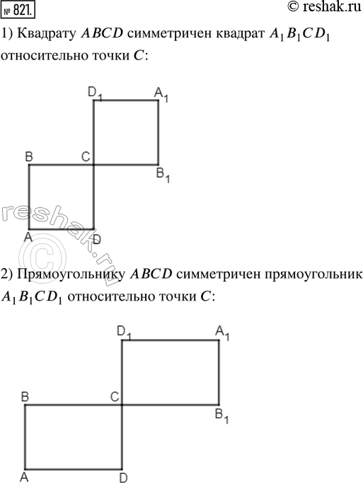 821. На нелинованной бумаге начертить: 1) квадрат со стороной 2 см; 2) прямоугольник со сторонами 2 см и 3 см. Построить четырёхугольник, симметричный данному относительно одной из его вершин.
