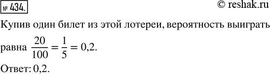 434. Для праздничной школьной лотереи изготовили 100 билетов. На каждый из них может выпасть один из 20 выигрышей. Какая вероятность выиграть, купив один билет этой лотереи?