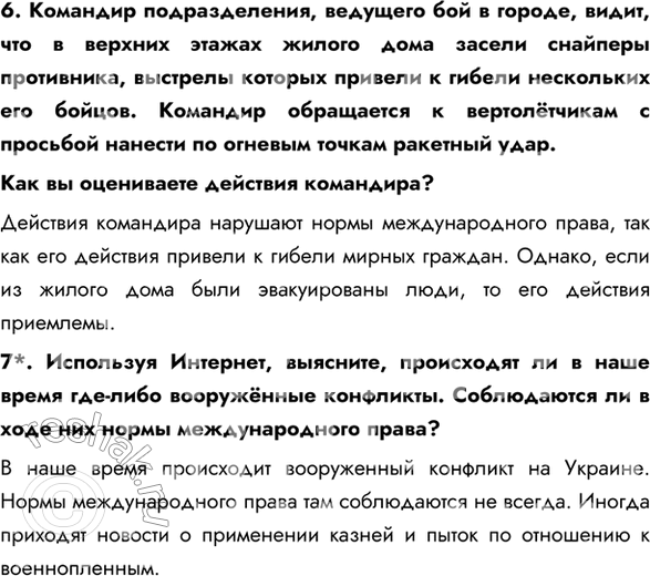 7*. Используя Интернет, выясните, происходят ли в наше время где-либо вооружённые конфликты. Соблюдаются ли в ходе них нормы международного права?