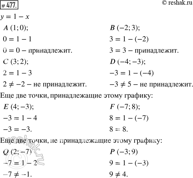 477 Принадлежит ли графику зависимости, заданной равенством у = 1-х, точка А( 1; 0)? В(-2; 3)? С(3; 2)? D(-4; -3)? Назовите координаты ещё двух точек, принадлежащих этому графику, и двух точек, не принадлежащих ему.