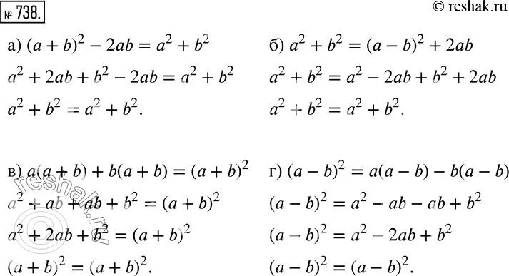 738 Доказываем Докажите, что: а) (а + b)2 - 2ab = а2 + b2; б) а2 + b2 = (а - b)2 + 2ab;