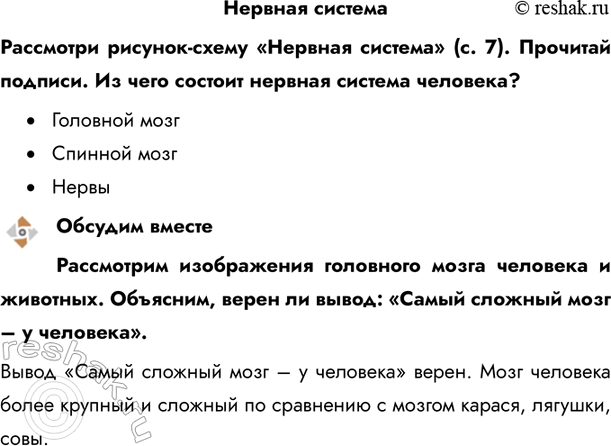 Нервная система Рассмотри рисунок-схему «Нервная система» (с. 7). Прочитай подписи. Из чего состоит нервная система человека? • Головной мозг • Спинной мозг • Нервы Обсудим вместе Рассмотрим изображения головного мозга человека и животных.