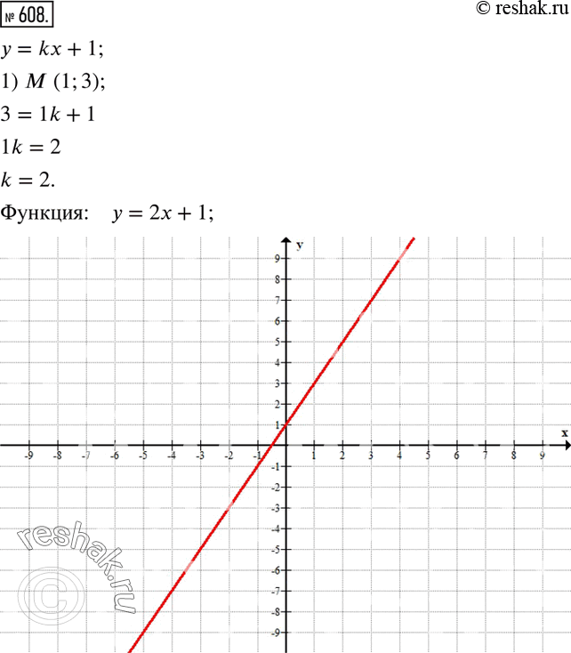 608. Построить график функции y=kx+1, если известно, что ему принадлежит точка: 1) M (1;3); 2) M (2;-7).
