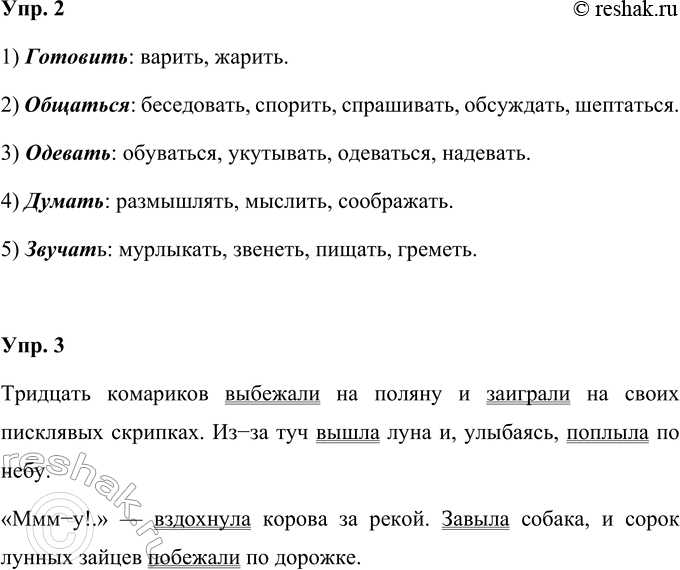 Упражнение 2. Прочитай глаголы, распредели их по группам в зависимости от значения: 1) готовить; 2) общаться; 3) одевать; 4) думать; 5) звучать.
