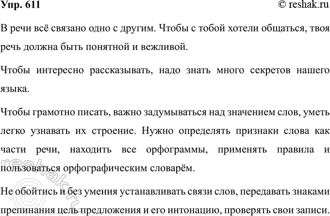 611. Вместе сделаем обобщение. Постарайся пересказать текст. Тебе помогут выделенные опорные слова. В речи всё связано одно с другим. Чтобы с тобой хотели общаться, твоя речь должна быть понятной и вежливой.