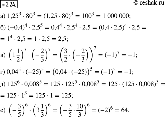3.24. Найдите значение выражения рациональным способом. а) (1,25)^3 · (80)^3; б) (-0,4)^4 · (2,5)^5; в) (1 1/2)^7 · (-2/3)^7; г) (0,04)^5 · (-25)^5;