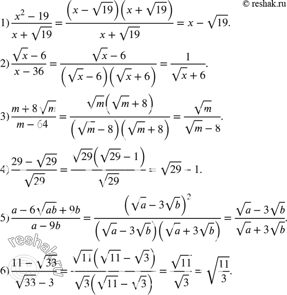 905. Сократите дробь: 1) (x2 - 19)/(x + корень 19); 2) (корень x - 6)/(x - 36);