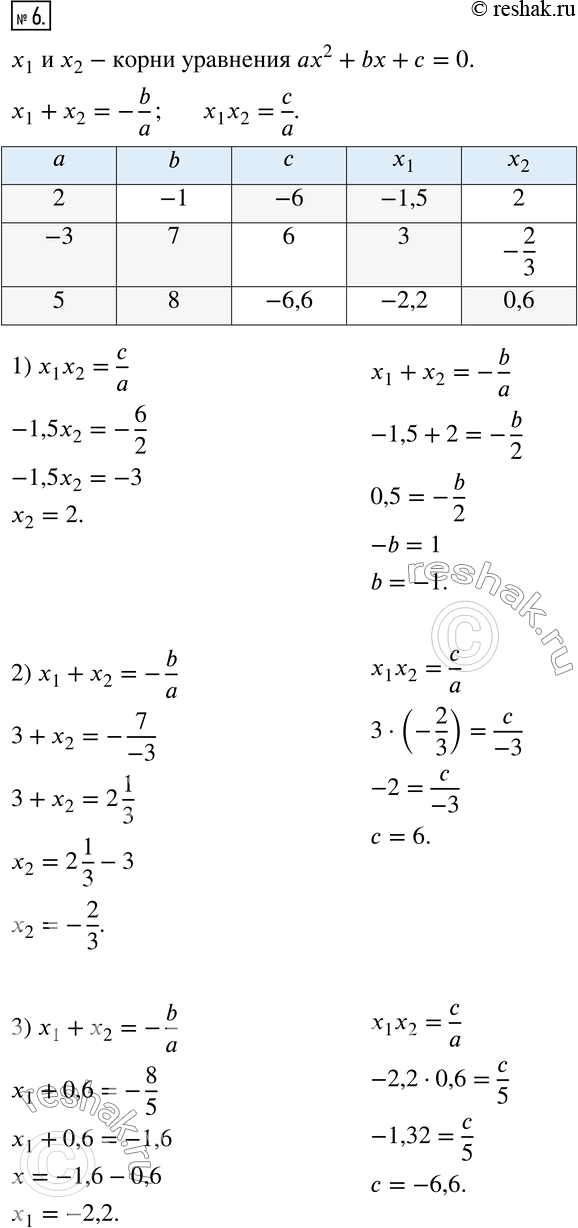 6. Пусть x_1 и x_2 - корни уравнения ax^2+bx+c=0. Заполните таблицу.