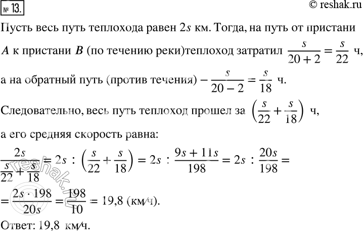 13. Теплоход прошёл по реке от пристани А к пристани В, а затем вернулся обратно. Собственная скорость теплохода равна 20 км/ч, а скорость течения — 2 км/ч. Найдите среднюю скорость теплохода на протяжении всего пути.