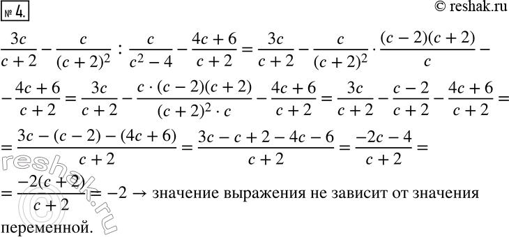 4. Докажите, что значение выражения 3c/(c+2)-c/(c+2)^2 : c/(c^2-4)-(4c+6)/(c+2) не зависит от значения входящей в него переменной.