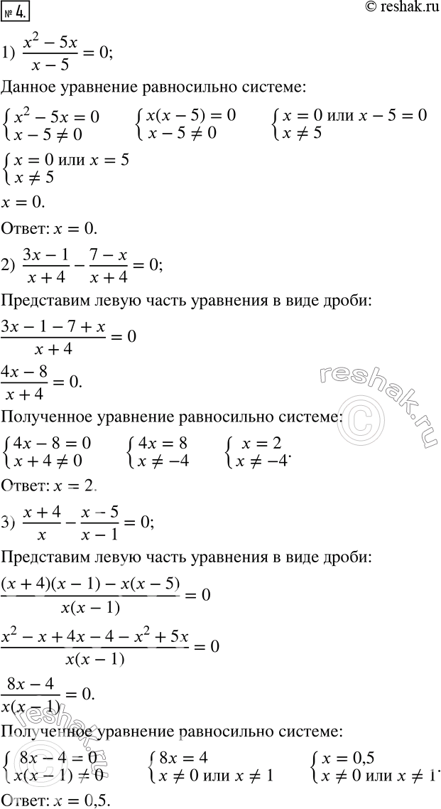 4. Решите уравнение: 1) (x^2-5x)/(x-5)=0; 2) (3x-1)/(x+4)-(7-x)/(x+4)=0; 3) (x+4)/x-(x-5)/(x-1)=0; 4) x/(x-8)-64/(x^2-8x)=0; 5) 3/(2x+3)+2/(5-3x)=0; 6) (2x^2-x+1)/(x-3)-2x=4.
