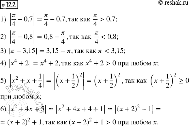 12.2. Раскройте модуль: 1) |?/4-0,7|; 2) |?/4-0,8|; 3) |?-3,15|; 4) |x^4+2|; 5) |x^2+x+1/4|; 6) |x^2+4x+5|.