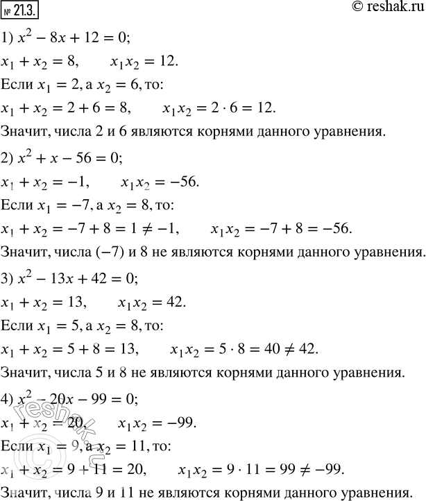 21.3. Применяя теорему, обратную теореме Виета, определите, являются ли корнями уравнения: 1) x^2-8x+12=0 числа 2 и 6; 2) x^2+x-56=0 числа (-7) и 8;