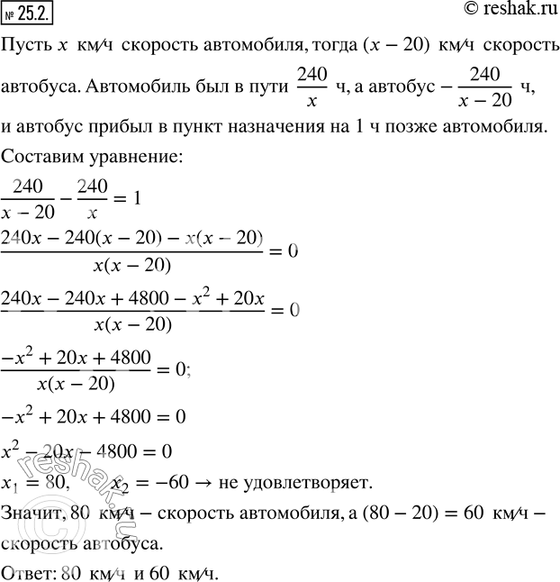 25.2. Из одного города в другой, расстояние между которыми равно 240 км, выехали одновременно автобус и автомобиль. Автобус двигался со скоростью на 20 км/ч меньшей, чем автомобиль, и прибыл в пункт назначения на 1 ч позже автомобиля.