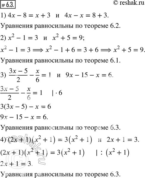 6.3. Обоснуйте равносильность уравнений: 1) 4x-8=x+3 и 4x-x=8+3; 2) x^2-1=3 и x^2+5=9; 3) (3x-5)/2-x/6=1 и 9x-15-x=6; 4) (2x+1)(x^2+1)=3(x^2+1) и 2x+1=3.