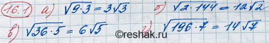 Вынесите множитель из-под знака корня: 15.1 а) корень (9*3); б) корень (2*144); в) корень (36*5); г) корень (196*7).