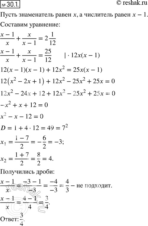 27.4. Числитель дроби на 1 меньше знаменателя. Если эту дробь сложить с обратной ей дробью, то получится 2*1/12. Найдите исходную дробь.