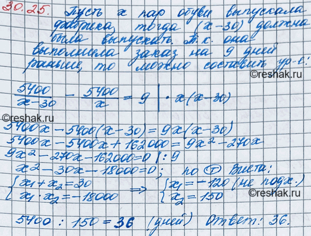 27.15. Мастерская к определенному сроку должна была выпустить 5400 пар обуви. Фактически она выпускала в день на 30 пар больше плана и выполнила заказ на 9 дней раньше срока. За сколько дней был выполнен заказ?