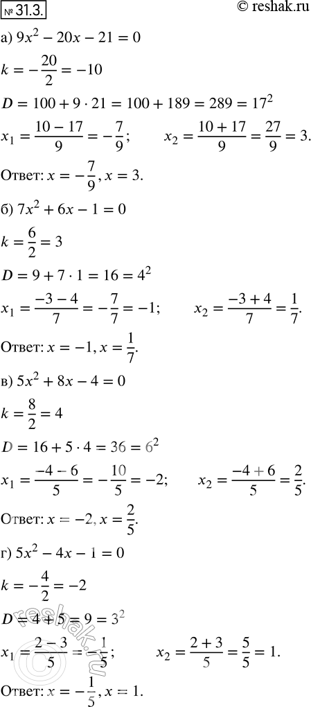 28.3. а) 9х2 - 20х - 21 = 0; б) 7х2 + 6х - 1 = 0; в) 5х2 + 8х - 4 = 0;