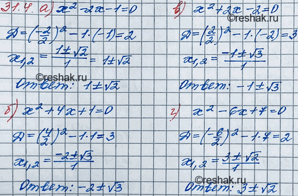 28.4. а) х2 - 2х - 1 = 0; б) х2 + 4х + 1 = 0; в) х2 + 2х - 2 = 0;