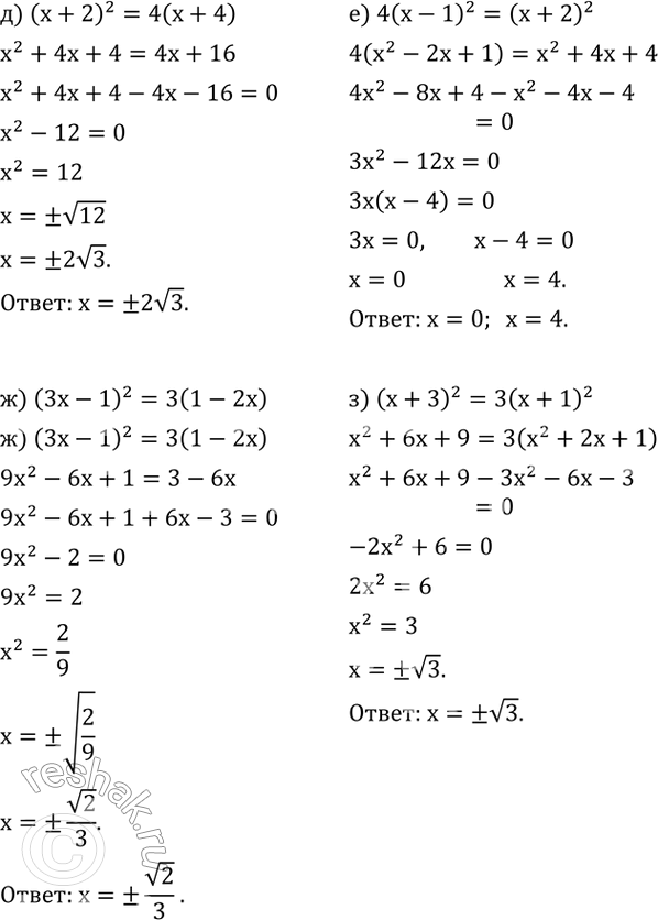 е) 4(x-1)^2=(x+2)^2;
