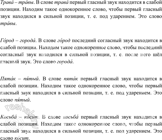 Образец рассуждения. Коса — косы. В слове коса первый гласный звук находится в слабой позиции. Находим такое однокоренное слово, чтобы первый гласный звук находился в сильной позиции, т. е. под ударением. Это слово косы.