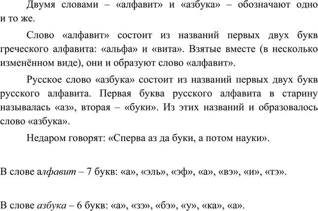 Прочитайте и перескажите текст. Спишите на выбор либо ту часть текста, где говорится о происхождении названия алфавит, либо ту часть текста, в которой говорится о происхождении названия азбука. Назовите буквы в словах алфавит и азбука.