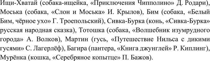 Вспомните и запишите клички животных, о которых вы читали в книгах. Ищи-Хватай (собака-ищейка, «Приключения Чипполино» Д. Родари), Моська (собака, «Слон и Моська» И.