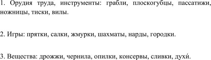 Запишите имена существительные, которые имеют форму только множественного числа. Продолжите перечисление названий: 1) орудий труда, инструментов; 2) игр; 3) веществ.