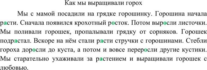 Горошина начала р..сти. Появился крохотный р..сток. Выр..сли листочки. Горошек подр..стал. Стали р..сти стручки с горошинами. Дор..ели до куста. Ухаживали за растением. Переросли другие кустики. Выращивали с любовью.