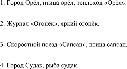 1. Город, птица, теплоход («Орёл», Орёл, орёл). 2. Журнал, яркий (огонёк, «Огонёк»). 3. Скоростной поезд, птица (сапсан, «Сапсан»). 4. Город, рыба (судак, Судак).