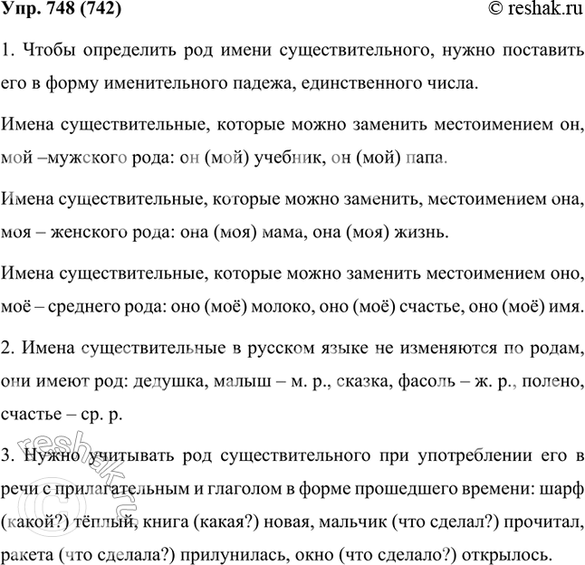 748 УЧИМСЯ ГОВОРИТЬ НА ЛИНГВИСТИЧЕСКУЮ ТЕМУ Выполните задания, подкрепив примерами свои суждения. 1. Расскажите, как вы определяете род существительного. Чтобы определить род имени существительного, нужно поставить его в форму именительного падежа, единственного числа.