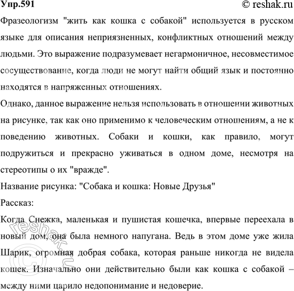 591 Есть в русском языке фразеологизм «жить как кошка с собакой». Опишите речевые ситуации, в которых его можно употребить. Можно ли сказать так по отношению к животным на рисунке? Почему? Какое название этого рисунка можно придумать? Напишите небольшой рассказ о том, как подружились собака и кошка.