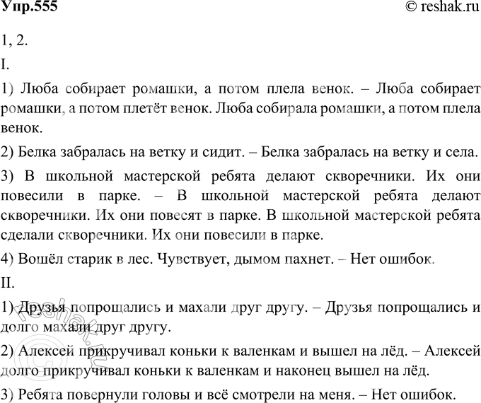 I. 1) Люба собирает ромашки, а потом плела венок. – Люба собирает ромашки, а потом плетёт венок. Люба собирала ромашки, а потом плела венок.