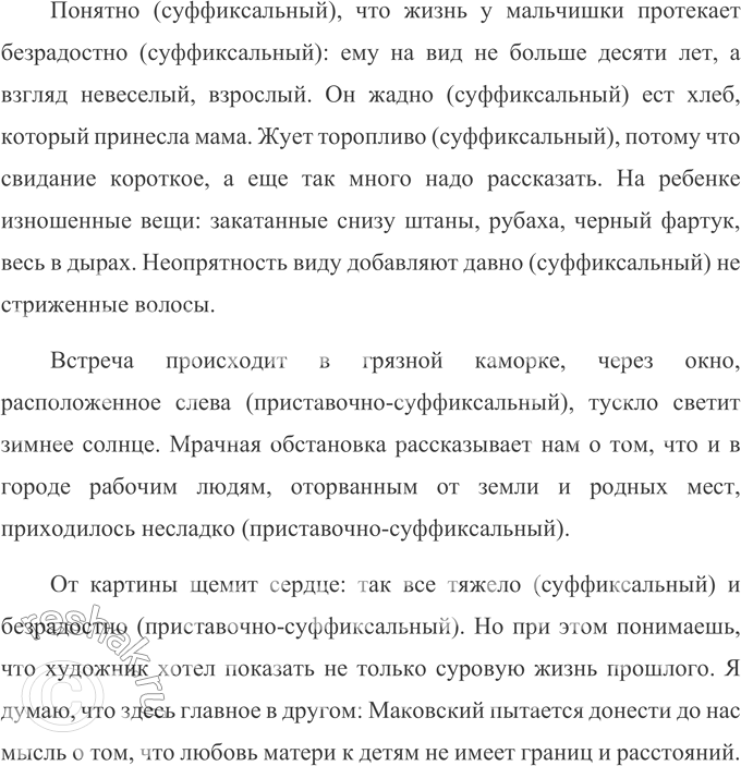 На картине Маковского «Свидание» запечатлена встреча матери с сыном. Похоже, что они очень редко (суффиксальный) встречаются, женщина смотрит грустно (суффиксальный) и сосредоточенно (суффиксальный) на своего ребенка. Видно, что ее сердце сжимается от жалости и боли, но изменить она ничего не в силах. Мама пришла издалека (приставочно-суффиксальный), скорее всего пешком. Выбрала время года, когда в деревне меньше всего работы: зиму. Женщина одета по-простому (приставочно-суффиксальный), по-деревенски (приставочно-суффиксальный), но чисто (суффиксальный) и опрятно (суффиксальный): черное пальто, красная юбка, платок.