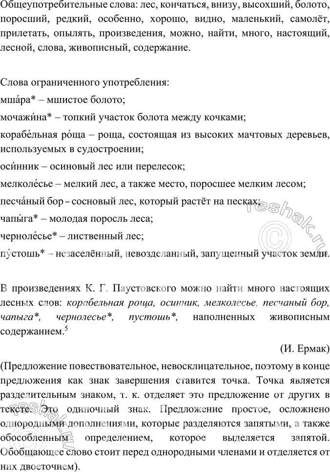 3. В произведениях К. Г. Паустовского можно найти много настоящих лесных слов: корабельная роща, осинник, песчаный бор, чапыга*, чернолесье*, пустошь*, наполненных живописным содержанием.