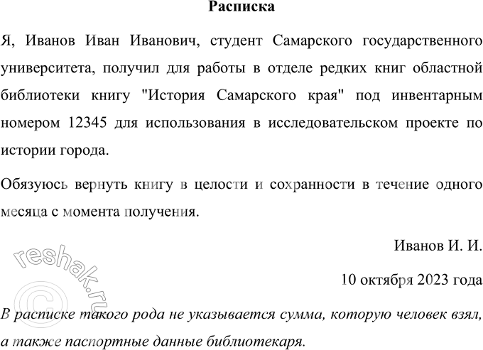 Представьте себе, что вы пришли в библиотеку в отдел редких книг. Вам подобрали нужную книгу и дали её под расписку. Оформите расписку. Удалось ли вам указать все нужные сведения?