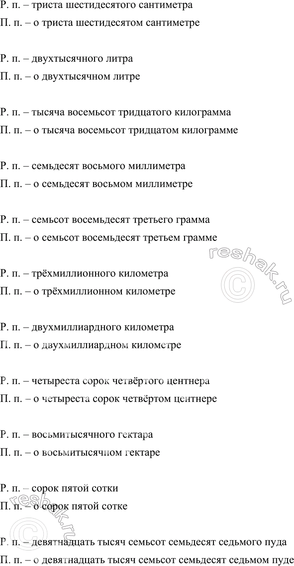 360 (сантиметр), 2000 (литр), 1830 (килограмм), 78 (миллиметр), 783 (грамм), 3 000 000 (километр), 2 000 000 000 (километр), 444 (центнер), 8000 (гектар), 45 (сотка), 19 777 (пуд).