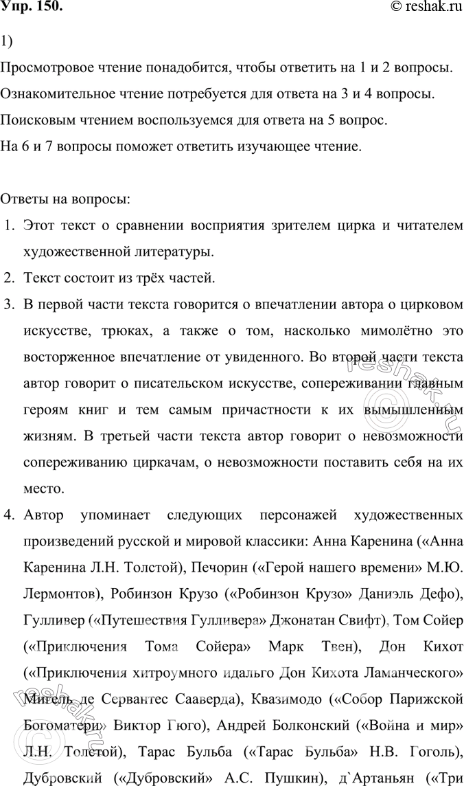 150. 1) Изучите вопросы, на которые вам предстоит ответить после работы с текстом. Подумайте, какие виды чтения вам понадобятся для этого.