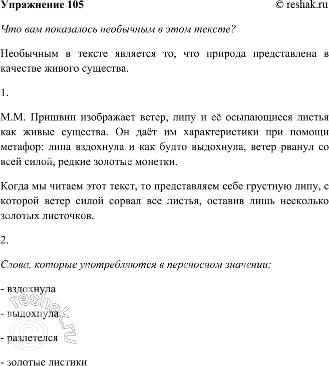 105 Прочитайте фрагмент рассказа М. Пришвина «Осеннее утро». Что вам показалось необычным в этом тексте? Ветер разлетелся, липа вздохнула и как будто выдохнула из себя миллион золотых листиков.