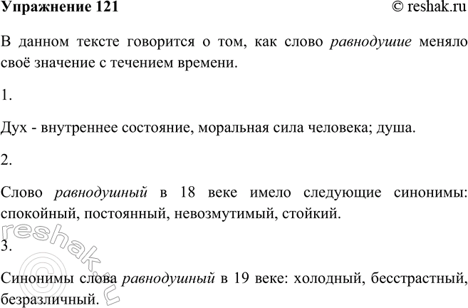 121 Прочитайте текст и подумайте, о чём он. Равнодушие В русском литературном языке XVIII века слово равнодушие употреблялось в значении «внутреннее спокойствие, твёрдость, постоянство, свойство человека, которого внезапность или опасность возмутить и дух его востревожить не может».
