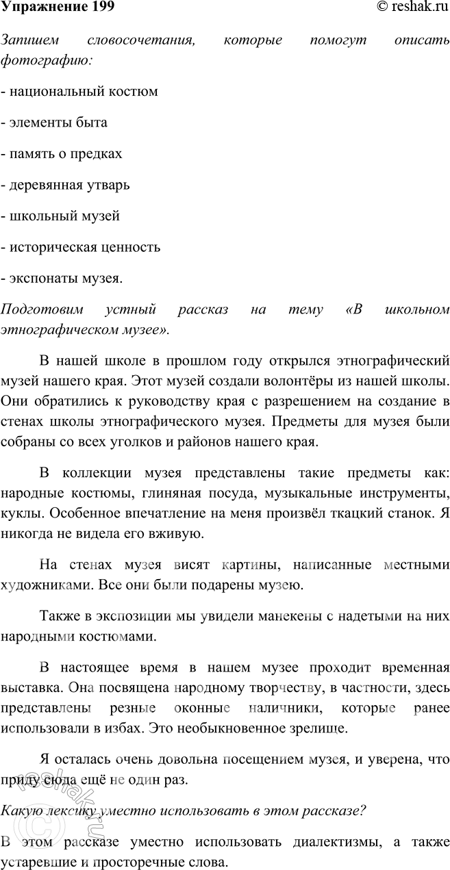199 Рассмотрите фотографию, составьте и запишите словосочетания, которые помогут её описать. Подготовьте устный рассказ на тему «В школьном этнографическом музее». Какую лексику уместно использовать в этом рассказе?