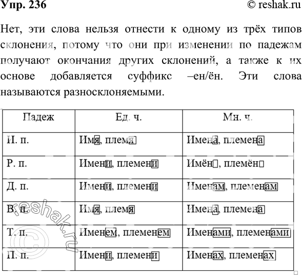 236 Рассмотрите таблицу и скажите, можно ли отнести слова в таблице к одному из трёх типов склонения. Свой ответ обоснуйте. Просклоняйте слова имя и племя.