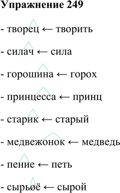 249 Запишите существительные, образованные способом суффиксации, выделяя словообразовательные суффиксы и указывая в скобках поизводящие слова. Используйте материал, данный на полях. Творец, силач, горошина, принцесса, старик, медвежонок, пение, сырьё.