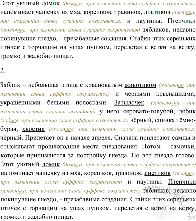 Зяблик – небольшая птица с красноватым животиком (животик, при изменении слова суффикс сохраняется) и чёрными крылышками, украшенными белыми полосками. Затылочек (затылочка, при изменении слова гласный выпадает) у него серовато-голубой, лобик (лобика, при изменении слова суффикс сохраняется) чёрный, спинка тёмно-бурая, хвостик (хвостика, при изменении слова суффикс сохраняется) чёрный. Прилетает он в начале апреля. Сначала прилетают самцы и отыскивают прошлогодние места гнездования. Потом – самочки, которые принимаются за постройку гнезда. Но вот гнездо готово. Этот уютный домик (домика, при изменении слова суффикс сохраняется) напоминает чашечку из мха, корешков, травинок, листиков (листика, при изменении слова суффикс сохраняется) и паутины. Птенчики (птенчика, при изменении слова суффикс сохраняется) зябликов, недавно покинувшие гнездо, - презабавные создания. Стайки этих сереньких птичек с торчащим на ушах пушком, перелетая с ветки на ветку, громко и жалобно пищат.